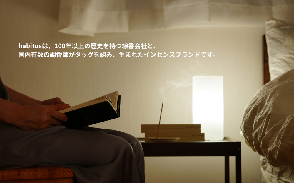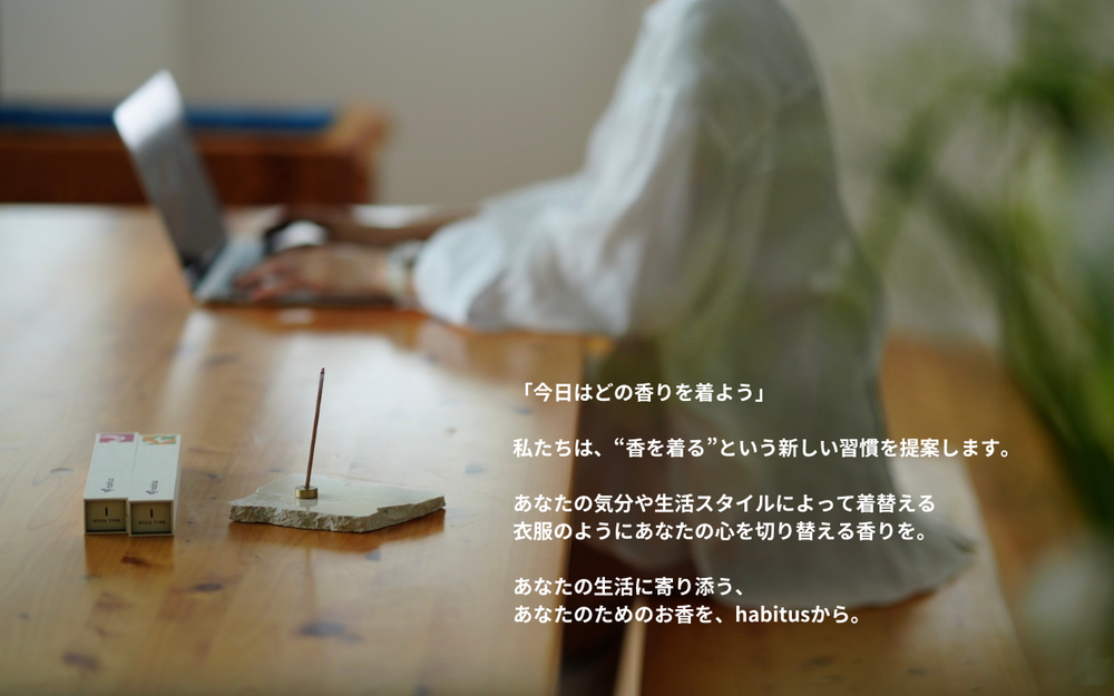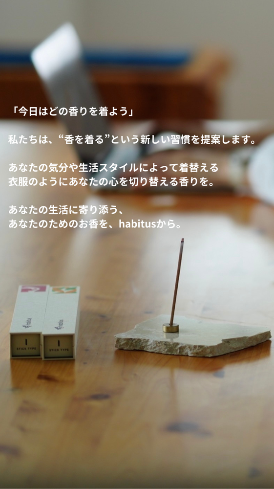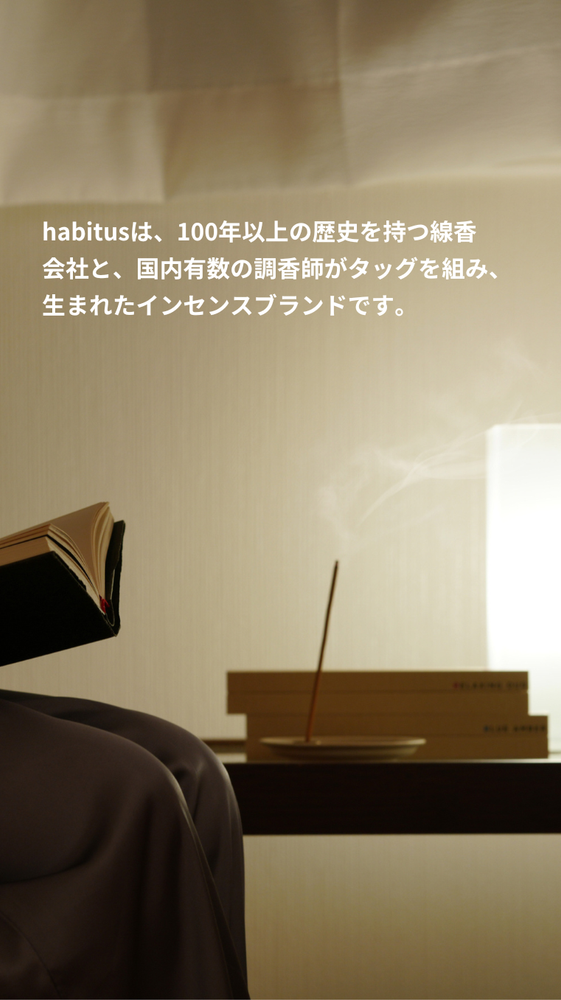 香りを着る。 「今日はどの香りを着よう」 私たちは"香を着る"という新しい習慣を提案します。 今日は大切な日だから勝負服を着よう。 お風呂から上がったらパジャマを着よう。 肌寒くなってきたから上着を羽織ろう。 気分や生活スタイルによって着替える衣服のように あなたの心を切り替える香りを。 あなたの生活に寄り添う、あなたのためのお香を habitusから。 habitusは、100年以上の歴史を持つ線香の会社と日本で有数の調香師たちが手を組み、立ち上がったインセンスブランドです。 これまでの線香という枠組みを飛び出し、私達がインセンス(お香)のブランドを立ち上げ、商品化することで、より幅広い世代の皆様にも本物の香りを知って欲しい、そしてお客様と一緒に香りを作り上げていきたいという想いを持っています。 将来的には、漢方屋のようにお客様一人一人へヒアリングを行い、個々に合った香りのインセンスを制作し提供したいと考えています。 はじめの商品として『朝・昼・夜に寄り添うお香』を製造しました。このお香を通じて、我々habitusチームだからこそ再現できる『本物』の香りを多くの方に楽しんでほしいと思っています。...